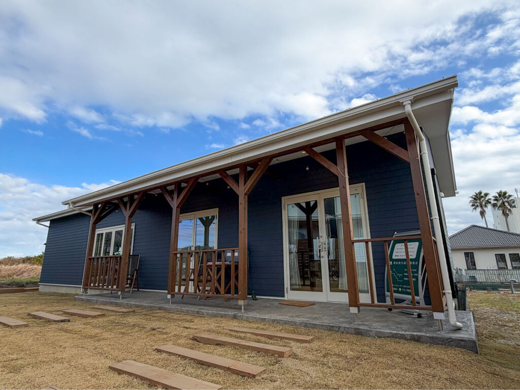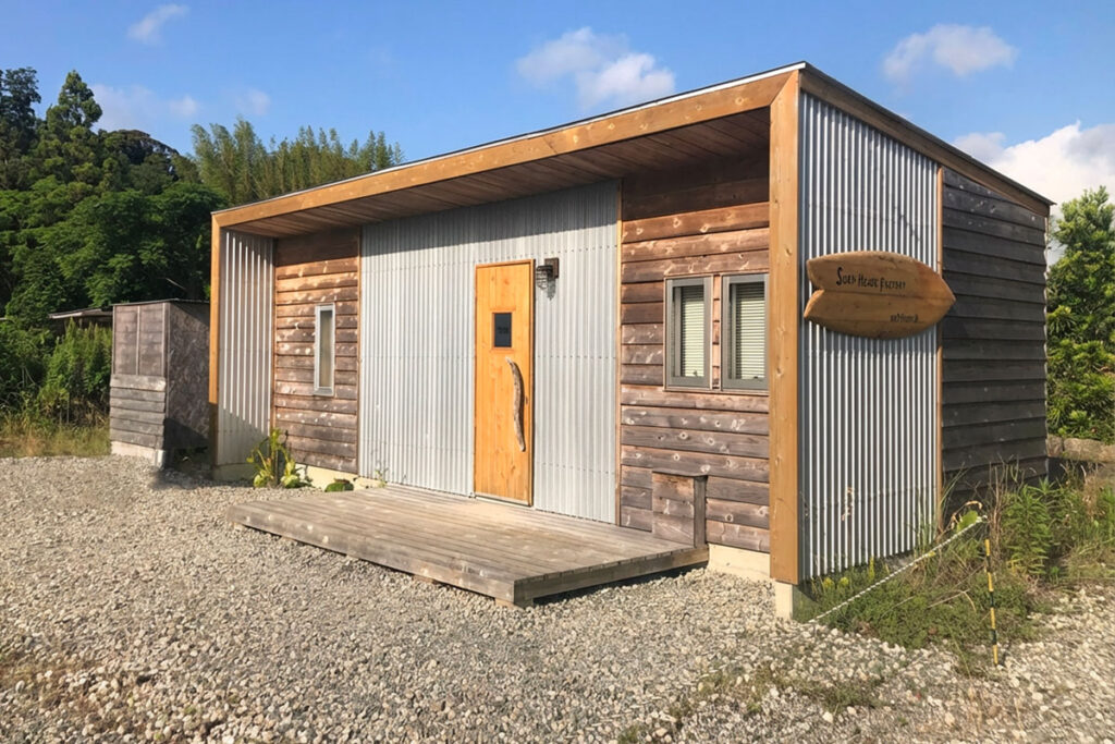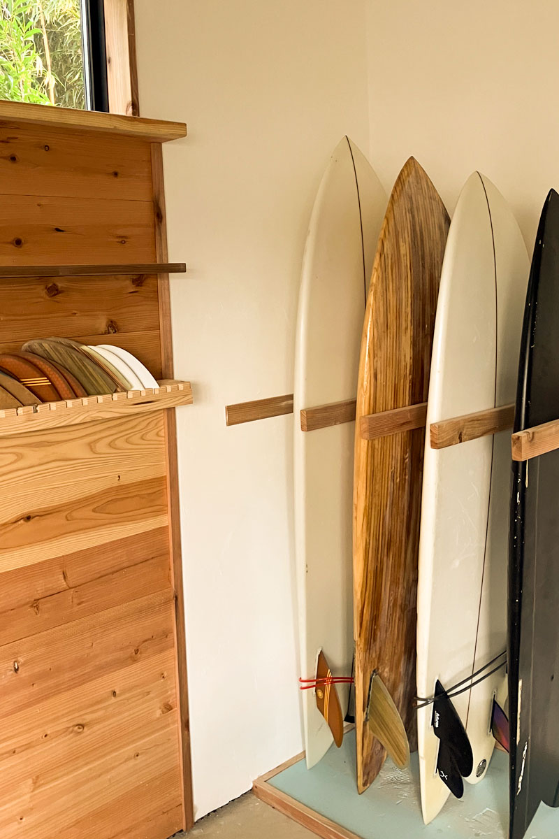 雨や強い日差しを避ける軒下空間。ウェットの着脱やボードの手入れ、仲間との集いの場としても活躍